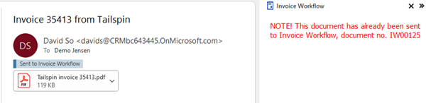 After the document is uploaded, the mail is updated with information from Business Central and handled according to your settings for the mailbox.