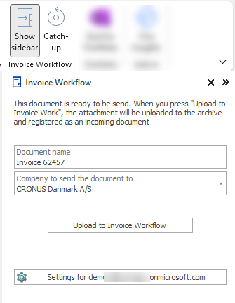 When an appropriate mail is selected, the mail subject will be suggested as document name. If your user are setup as Invoice Workflow approver in multiple companies, you will be able to select what company, the PDF should be uploaded into.