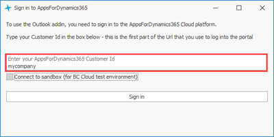 From the example here, your Customer Id is mycompany If you are using Business Central Cloud and want to connect to a sandbox environment, check the "Connect to sandbox.." option.